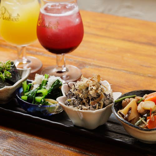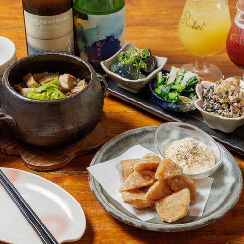 古民家風のおしゃれ空間でご提供する"創作料理"は60種類以上!どれもヘルシーなのに満足感たっぷりで、旬の素材で炊き上げる土鍋ご飯や季節のおばんざい、新感覚のおつまみまで幅広くございます◎
